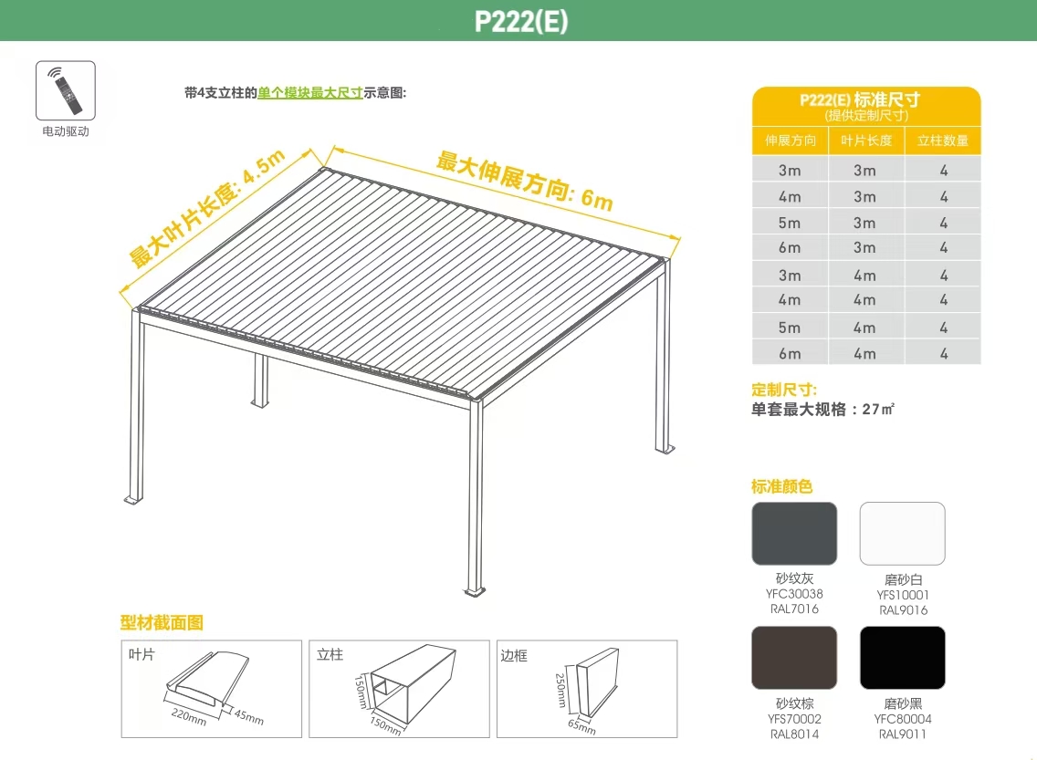 如何合理利用好戶外空間?安裝一個戶外休閑涼亭是一個不錯的選擇。賀濼的休閑涼亭適用于任何戶外空間,包括庭院、花園、露臺等。我們的涼亭頂部為百葉式的設(shè)計,可以手動或電動調(diào)節(jié)。它在敞開狀態(tài)時可以透風(fēng)散熱,在關(guān)閉狀態(tài)時就可以遮陽擋雨。它的整體設(shè)計優(yōu)雅美觀,可以和周圍的環(huán)境完美融合。另外我們還提供多種選配,包括防風(fēng)卷簾、百葉窗、玻璃推拉門等,為你創(chuàng)造一個多功能的休閑戶外空間。如果你想了解更多,請隨時聯(lián)系我們。